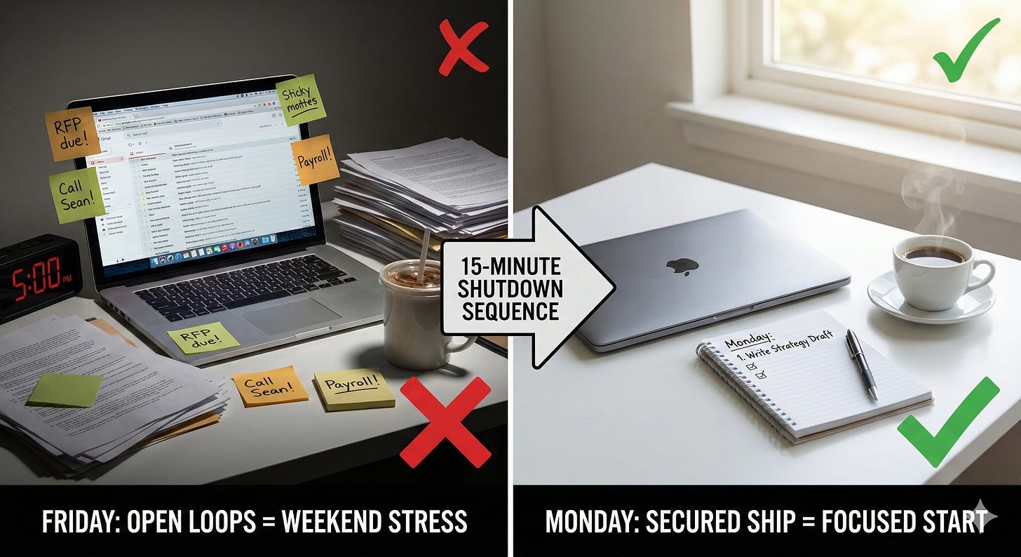 If you just “stop working” without actually “finishing the week,” you aren’t really leaving. You are just moving the office into your subconscious.