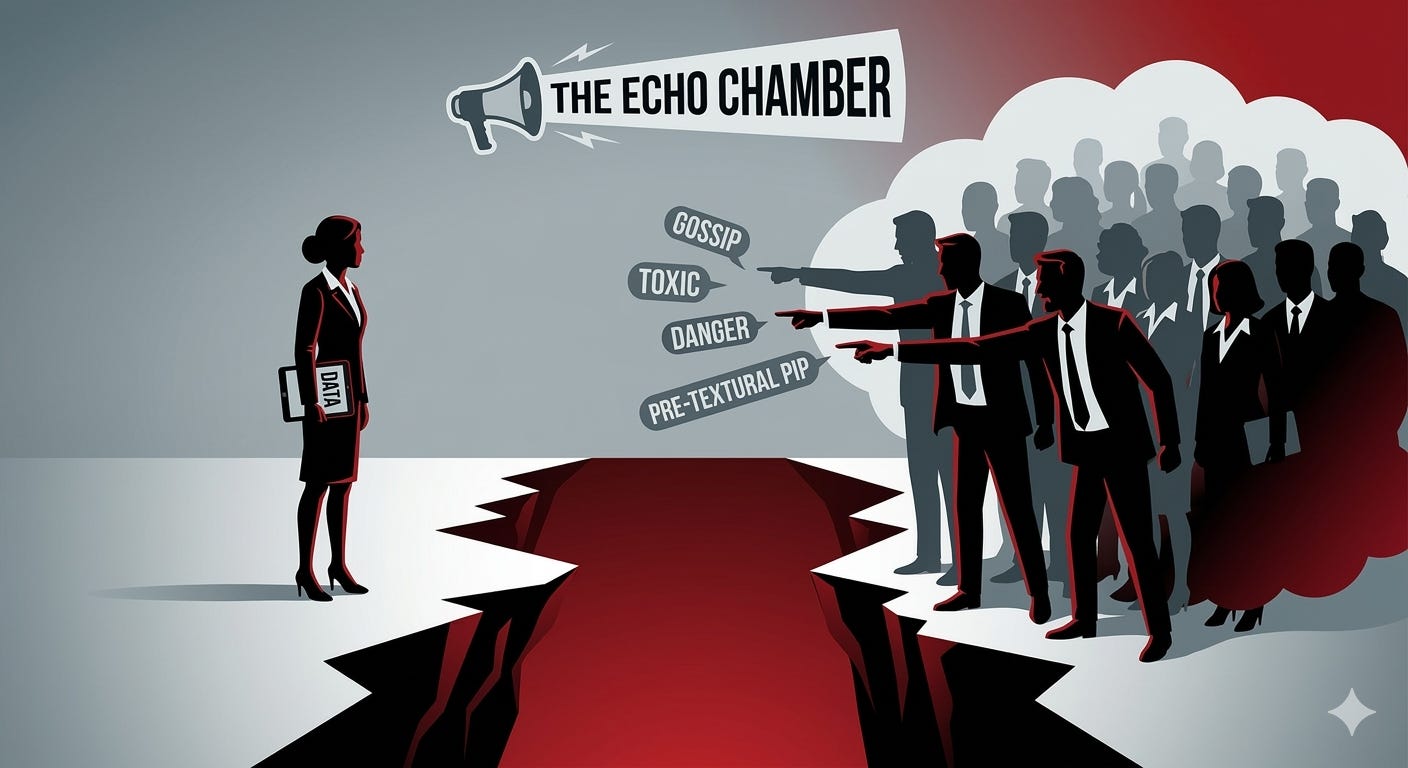 The Purge: If the isolation and scaled abuse are unsuccessful in forcing the scapegoat to quit, the organization initiates the final phase: the paper trail. Management suddenly weaponizes coaching sessions and performance reviews, suddenly finding fault in work that was previously praised, or places the employee on a rigid, impossible-to-pass Performance Improvement Plan (PIP). The organization builds a pretextual case to formally remove the employee, essentially sacrificing them to restore the artificial harmony of the echo chamber.